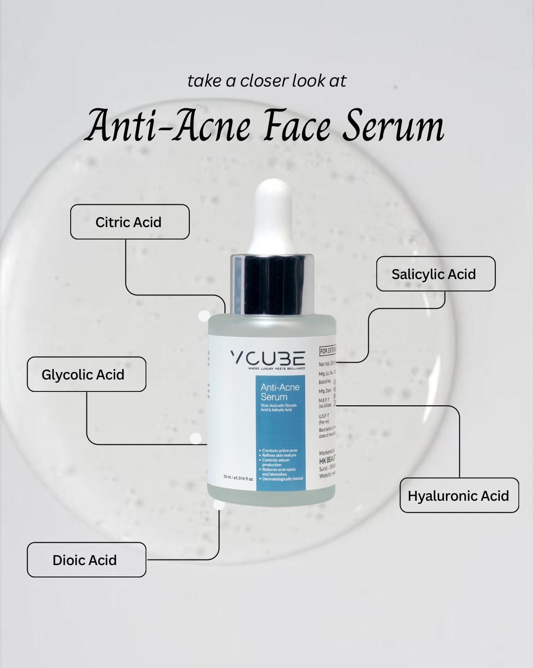 VCUBE Anti-Acne Serum is an advanced, dermatologically tested formula designed to target acne, blackheads, dark spots, and uneven skin texture. This powerful blend of actives deeply exfoliates, purifies, and hydrates the skin — without irritation.